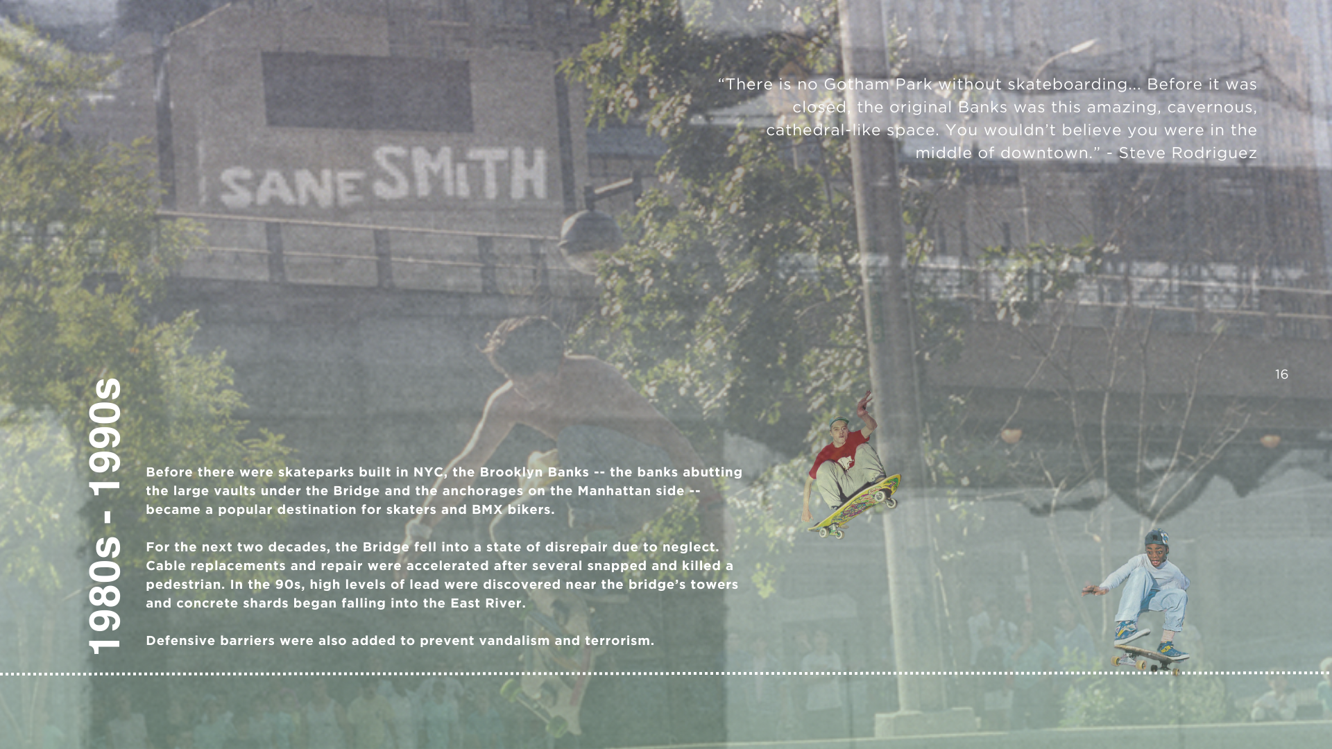 For nearly a century after its completion in 1883, the Brooklyn Bridge functioned as the mixed-use center of the neighborhood — its anchorages were used as wine cellars and the arcades were populated with commercial spaces. 100 years later, the sloping embankments became a beloved site for the city’s skateboarders and BMX bikers. Beginning in the late 20th century, however, public access and activity around the Bridge at street level has been slowly choked off. After decades of disuse and disinvestment, a coalition of community advocates led by the nonprofit organization Gotham Park has been working to reopen and reactivate the Arches — nine acres of public space within, underneath, and around the Brooklyn Bridge on the Manhattan side.